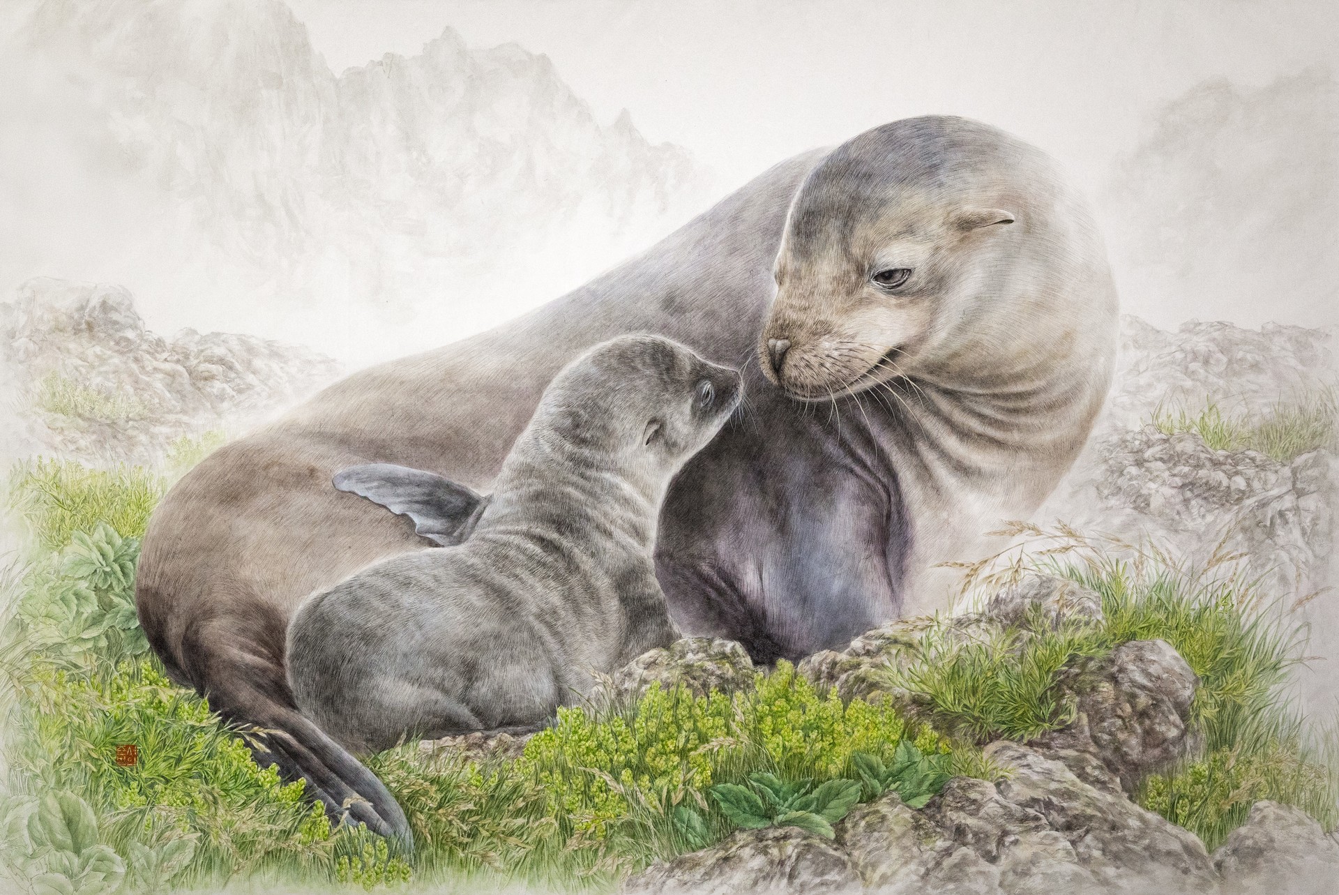 독도에서 어미 강치와 아기 강치가 함께 머물며, 한때 이 섬에서 가능했을 사랑과 교감의 순간이 놓여 있다. 〈회상〉은 사라진 생명을 애도하기보다, 만약 그 시간이 계속되었다면 존재했을지도 모를 강치들의 모습을 떠올리게 한다.