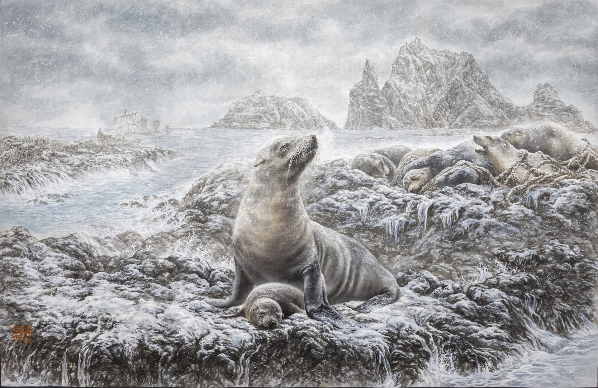 독도 가제바위에 머물렀던 강치는, 자연의 섭리가 아닌 계획에 의해 멸종된 생명이다.작품 속 강치는 본래 존재할 수 없는 ‘겨울의 독도’에 놓여 있다. 이 겨울은 자연의 계절이 아니라, 고립 속에서 외면당한 생명이 느꼈을